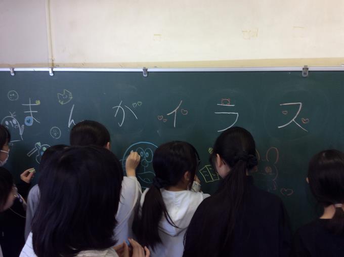 (↑まんがイラストクラブが撮影のための黒板を準備中)