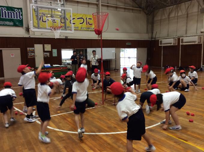 種目は、お助け玉入れ、フラフープリレー、ピンポン運びの3つです。お助け玉入れでは、まず1年生だけが玉入れを行ったあとに、かごの高さを高くし、6年生も参加して玉入れを行いました。