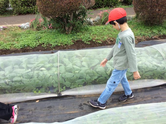 薬園台高校の園芸科のお兄さん、お姉さんたちに教えてもらって蒔いた小松菜と大根。あれから約一ヶ月が経ちました。野菜がどう生長しているのか、畑にお邪魔して野菜の様子を2年生が見に行きました。