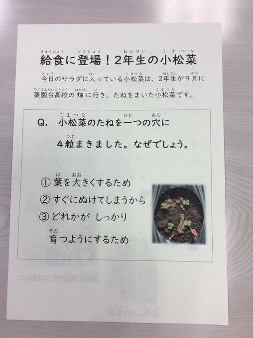 給食の時間には栄養士の先生が全校児童に「2年生とひまわり学級のみなさんが種まきをして、薬園台高校の園芸科のお兄さん・お姉さんが育ててくれた小松菜を使っています。」と放送でお知らせをしてくれました。