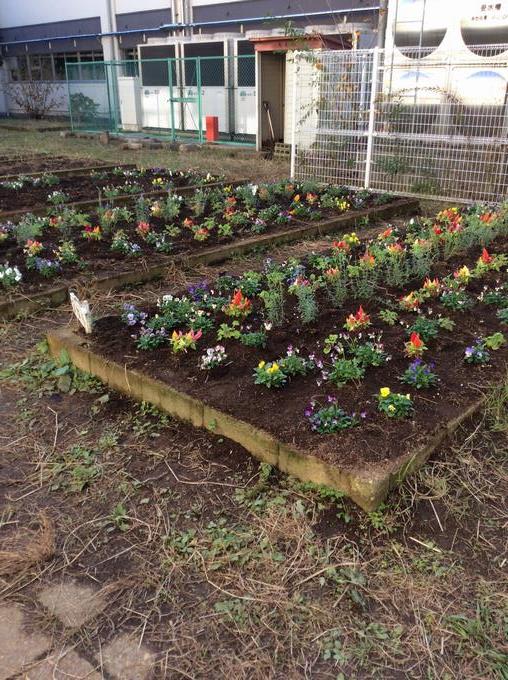 千葉県園芸協会による花育授業で、3年生が中庭の花壇に花を植えることになりました。