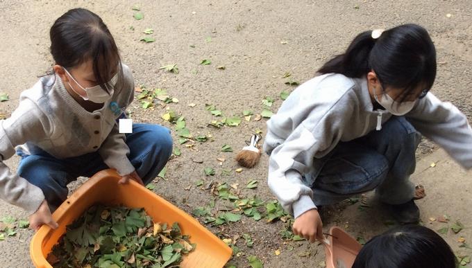 登校の見守りから帰ると、用務員さんに混じって委員会の児童が落ち葉掃きをしていました。