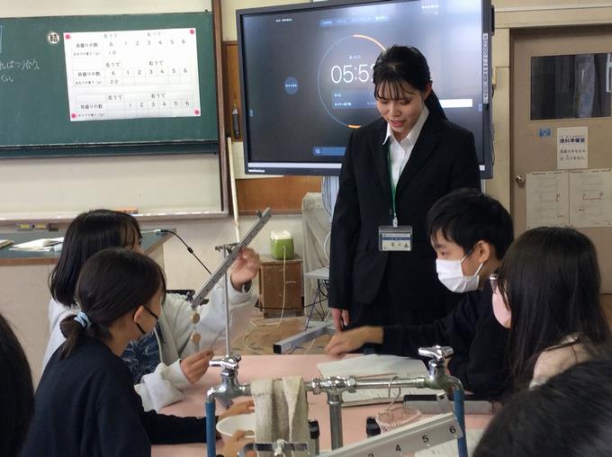 ↑てこのはたらきの授業。実験からわかったことの話し合いで助言しています。