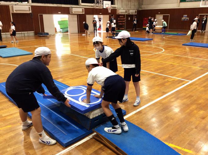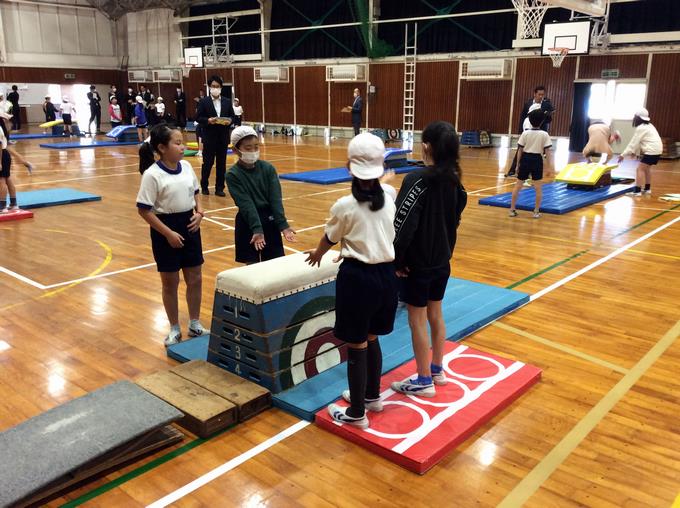 この日の学習は、「台上前転」を跳ぶために、自分が跳べそうな場を選び、「踏み切り・着手・回転・着地」の4つの中からめあてを決めて取り組むものでした。