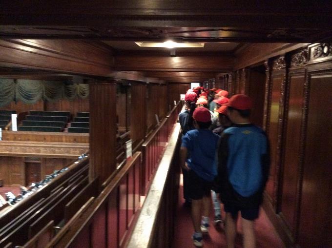 午前中は、国会議事堂の見学です。色々な部屋があり、入り口に掲げられている表示を見て「○○党の部屋なんだね」という発見をしたり、廊下に敷かれている絨毯を見て「おーっ、絨毯!」という小さな声(国会では見学中の私語は控えるようなっています。)がしたりしました。