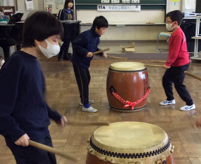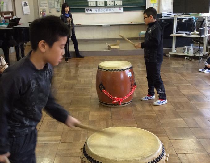 音の発信源は音楽室。中を見ると、4年生が和太鼓を叩いていました。