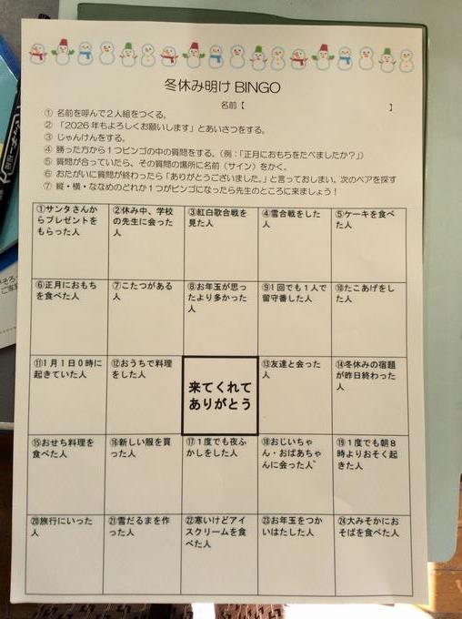 「冬休みビンゴ」をしているクラス