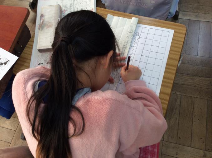 昼休みには3~6年生の各学年で代表に選ばれた児童が市の書き初め展に向けての作品作りに取り組みました。