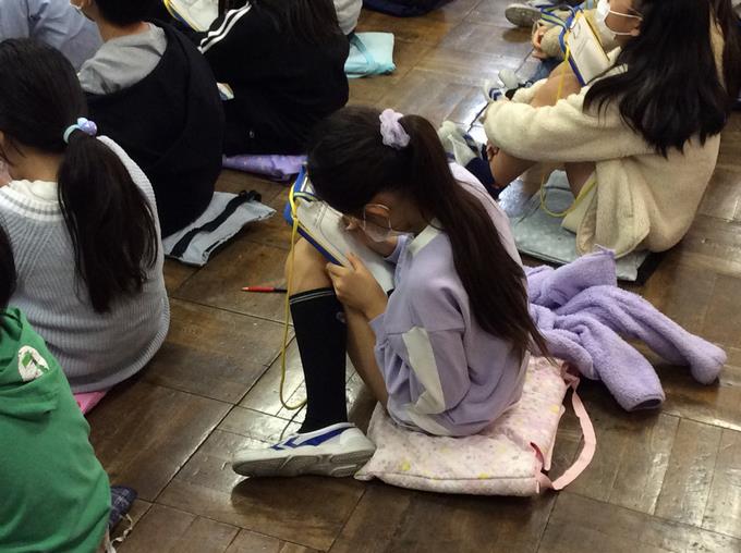 3時間目、校内に不審な人が侵入したという設定で、船橋東警察署の方をお招きして、避難訓練を行いました。
