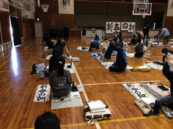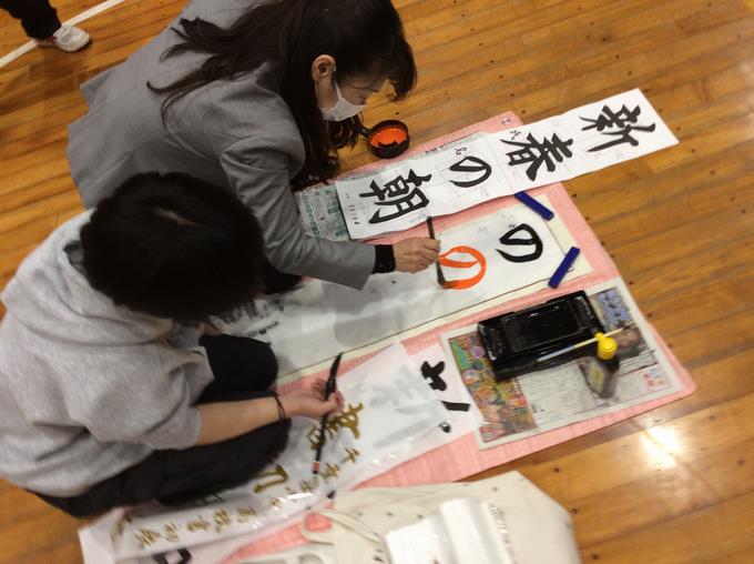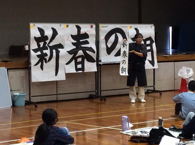 去年は体育館改修のため実施できなかった薬園台高校書道部による書き初め指導が6年生に向けて行われました。