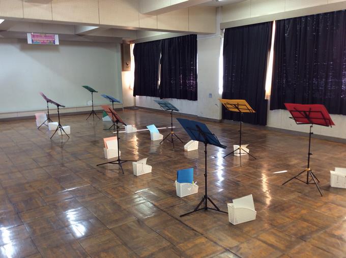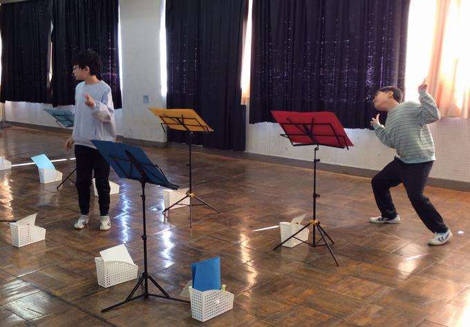 今日は、立ち位置などを確認するために、少し広い教室に場所を移して練習しました。