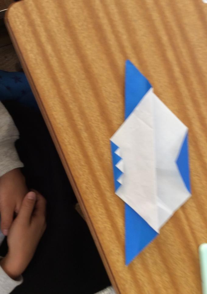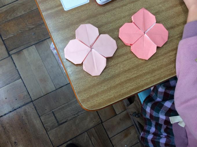 1年生の教室では、折り紙でお正月の飾りづくり。