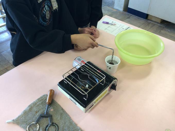 今回の実験では、実験用コンロを使用するということで、机の上やその周りに危険がないように、片付けをしっかり行いました。椅子も端に寄せて、準備万端。