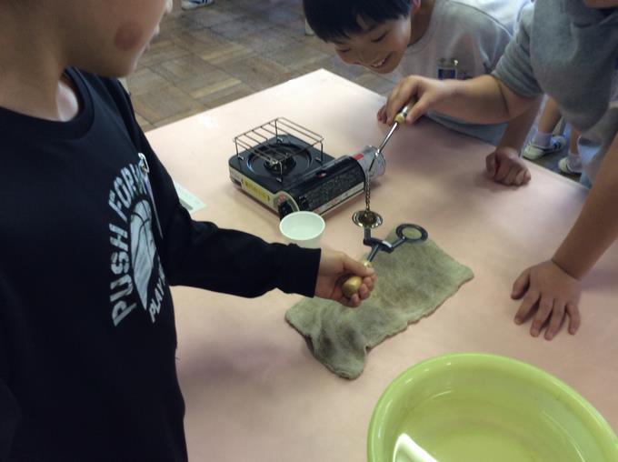 このほかにも、冷やした鉄球、熱した鉄球が穴に通るか実験しました。