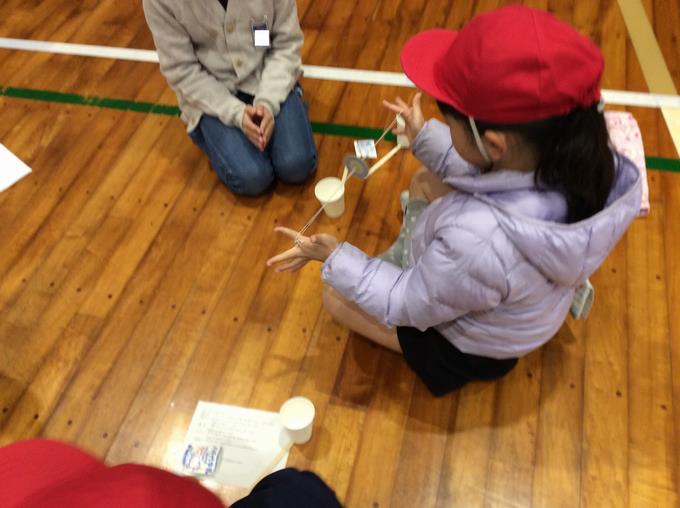 紙コップをつかったボールキャッチやぶんぶんごまなど、ペアの子が作った道具でみんな楽しそうに遊んでいました。