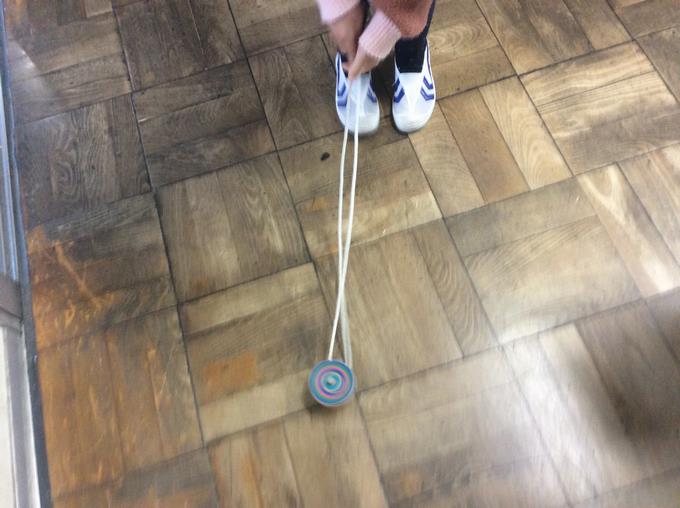 しばらく見ていると、「先生もやってみる?」と紐がかかった状態のコマを渡してくれる子がいました。