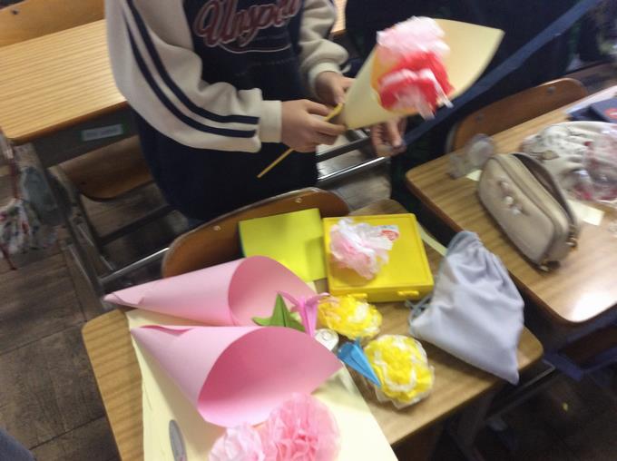 5年生の教室では同じ委員会の6年生に送るために花を作っている子がいました。