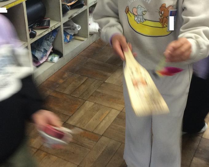2年生の教室を覗くと、羽根つきやコマ回しをしていました。
