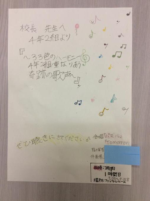 先日、道徳の授業を行った後に、その学級の先生から、「校長先生が授業で聞かせたくれた歌を子供達が気に入って、インターネットで検索した子もいるのですが、どこにも見つからなくて・・・。でも子供たちが歌いたいといっているのであの曲を教えてくれませんか。」と相談がありました。すると、それから10日ほどたったある日、子供たちが招待状を持ってきてくれました。