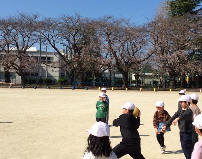咲いたばかりの桜に囲まれて、1年生がドッチボールをしていました。