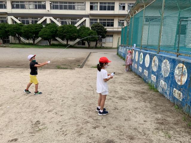 1年生が生活科学習の一環で、自作の水鉄砲や船で遊びました。水鉄砲は的当てをしたり、地面に水で絵を描いたりして、船は水槽に浮かべて遊びました。遊び方も競い合ったり協力し合ったりして楽しそうでした。
