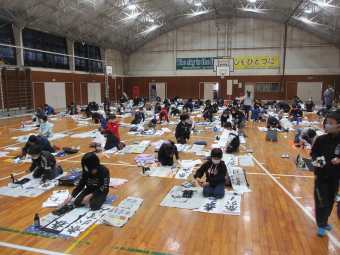 特別非常勤講師をお迎えし、書き初めの仕上げである席書会を行いました。会場の体育館は寒く感じましたが、緊張感をもって真剣に取り組む姿がありました。