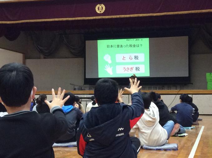6年生の社会科学習では日本国憲法や三権分立、法令や予算との関わりについて学びます。今日は、税の専門家である税理士さんから、税金の働きや歴史、種類や数、めずらしい税などについて教えていただきました。クイズを交えてわかりやすくご指導いただきました。