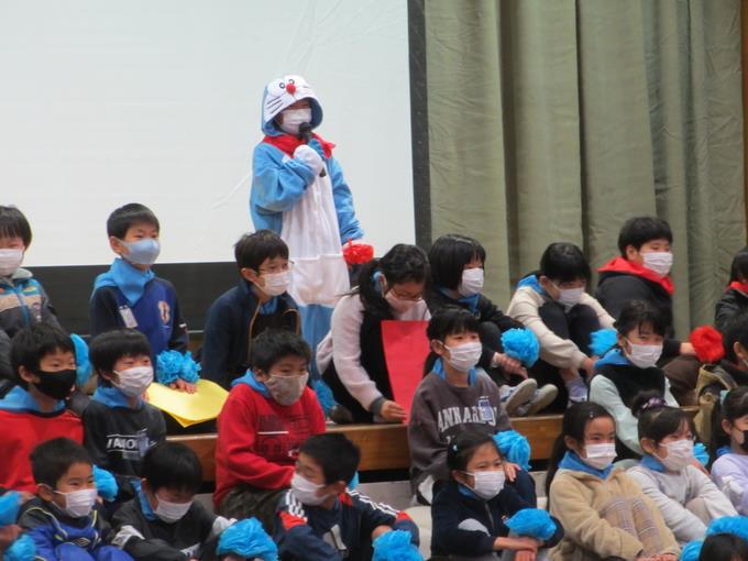 2番手は、3年生です。ドラえもんの案内でタイムマシンに乗り、クイズに答えながら6年間を振り返ります。クイズの後はドラえもんの曲に合わせて、ボディーパーカッションを披露しました。
