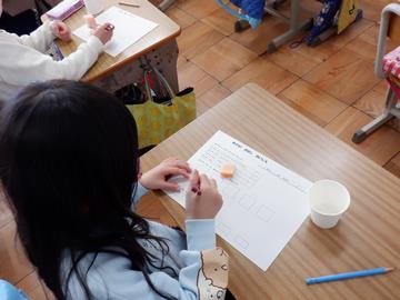 次に、正しいはしの持ち方で、スポンジを並べたり、重ねたりしました。子どもはかなり苦労していました。最後に、「さしばし」や「よせばし」など、やってはいけない「はしの使い方」を学ぶことができました。