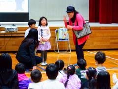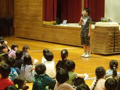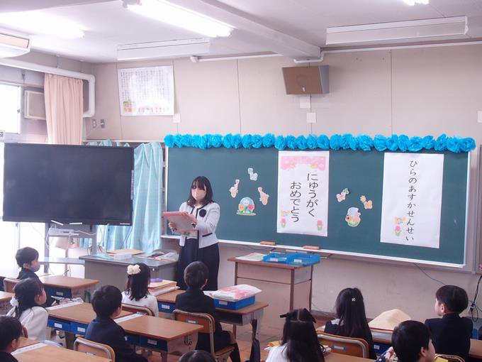 まず、2年生からは、アサガオの種のプレゼントがありました。次に3年生から5年生までは、学校のいろいろなきまりや約束事、小学校生活について、映像を使っての楽しくわかりやすい説明がありました。