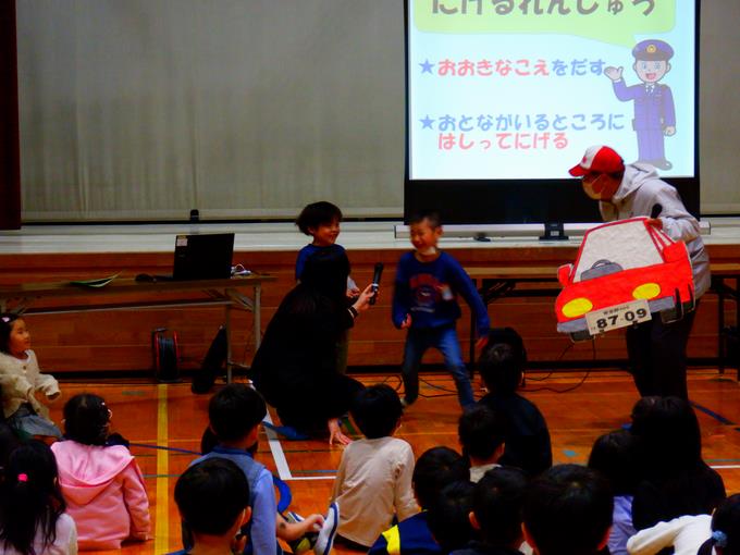まず、世の中には、いい人と悪い人がいて、悪い人に誘拐される危険があるというお話でした。誘拐されないために、「たすけて~!」と大きな声で叫び、近くの大人に助けを求めることを教えてもらいました。