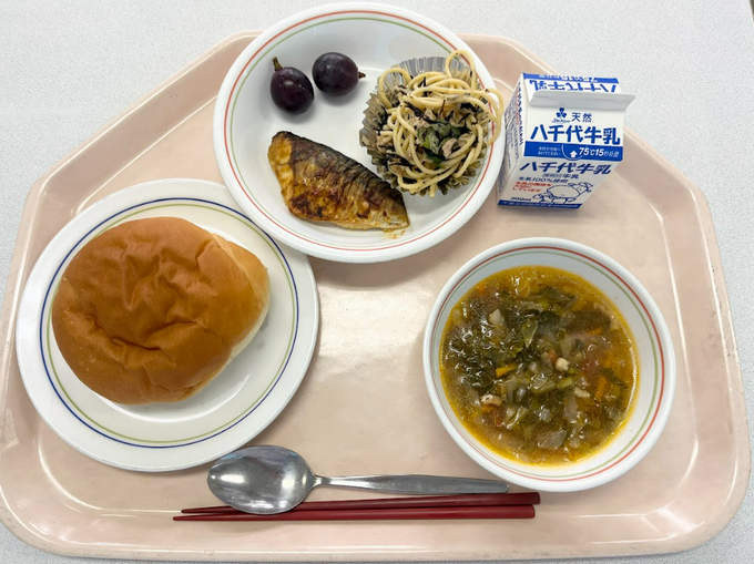 【B献立】カルシウムパン 鯖のタンドリー風 ひじきとツナのパスタサラダ ひよこ豆のスープ 巨峰