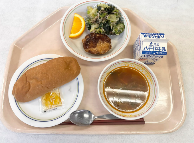 【B献立】ブランコッペパン みかんジャム おさつコロッケ きのことわかめのサラダ シーフードトマトスープ オレンジ