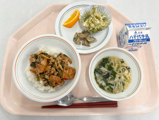 【A献立】ホイコーロー丼 昆布和え 揚げ里芋の青のり風味 卵とわかめのスープ オレンジ