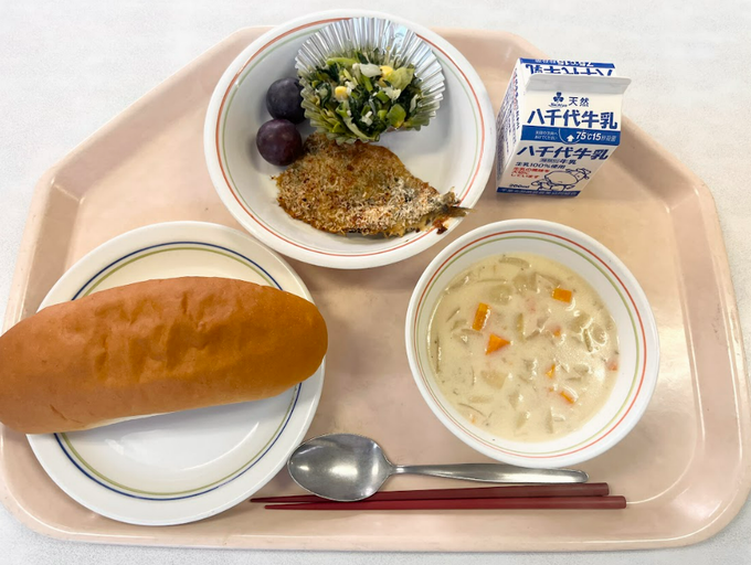 【B献立】さつま芋パン 鰯のチーズパン粉焼き 小松菜とコーンのサラダ 豆のクリームポタージュ 巨峰