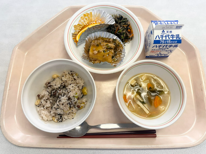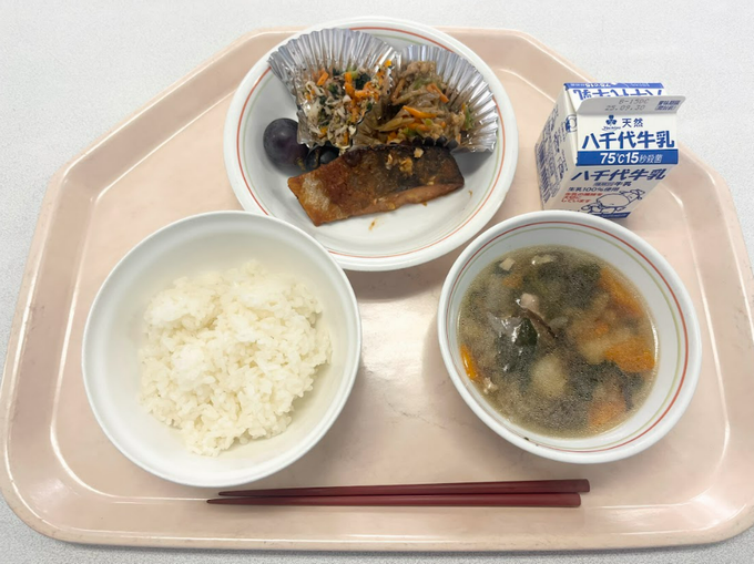 【A献立】 ご飯 鰯のかば焼き風 ごまあえ 打ち豆のみそ汁 巨峰