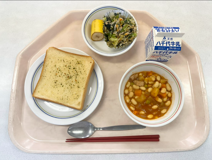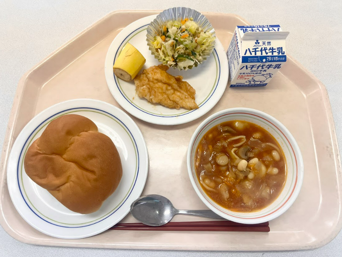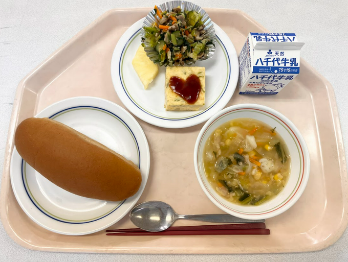 【B献立】 あんバターサンド 船橋産スズキのムニエルトマトソース 大豆サラダ ウィンナーと野菜のスープ 船橋産の梨