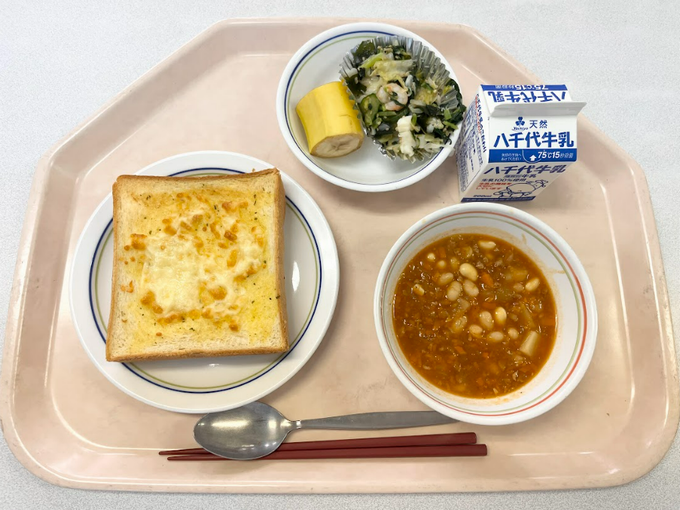 【B献立】カレーマヨチーズトースト シーフードサラダ チリ・コン・カーン バナナ
