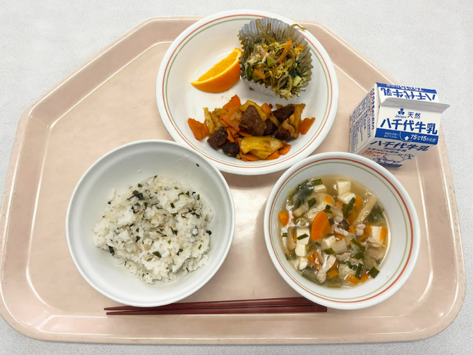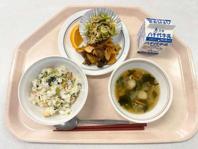 【A献立】わかめご飯 レバーと野菜の揚げ煮 昆布和え 塩ちゃんこ鍋風スープ オレンジ