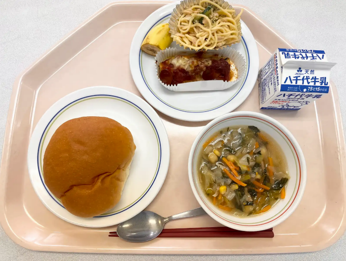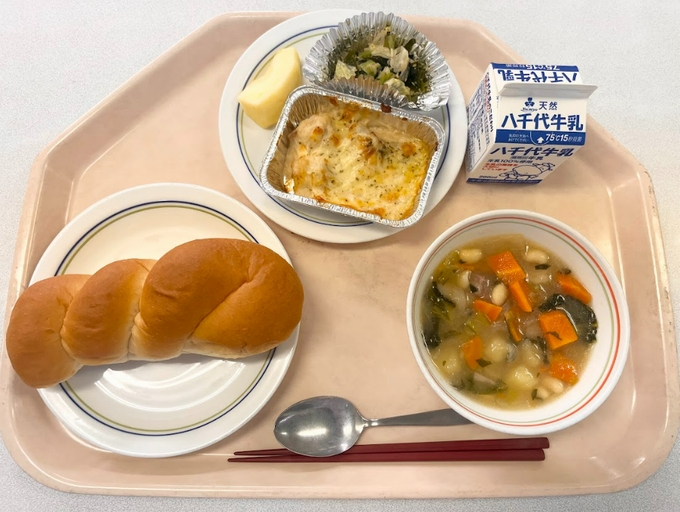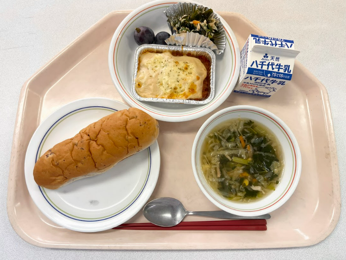 【B献立】甘納豆パン ラザニア ツナとわかめのサラダ キャベツとベーコンのスープ 巨峰
