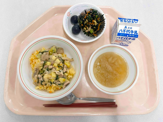 【A献立】キャロットライス小松菜ソースかけ ひじきと青大豆のマリネサラダ キャベとコーンのスープ 巨峰