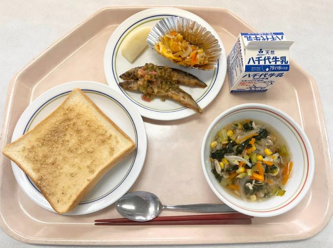 【B献立】シナモンセサミトースト ししゃものラビコットソース ジャーマンポテト ジュリアンスープ りんご