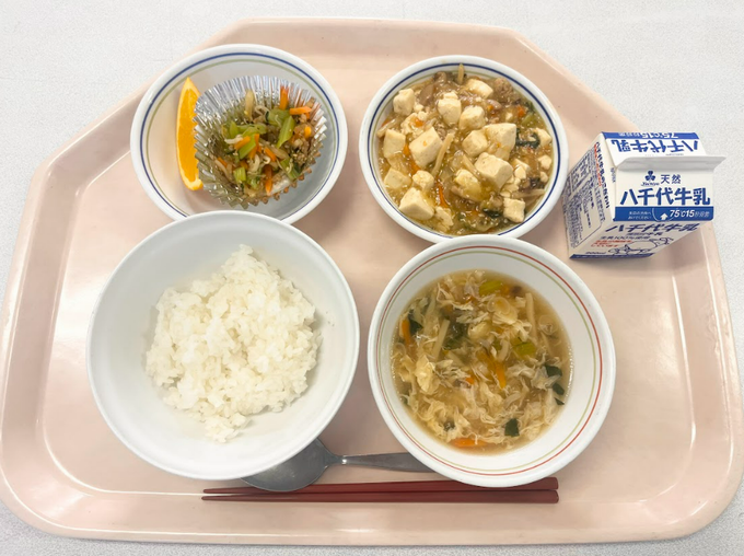 【A献立】ご飯 四川豆腐 ナムル 卵と春雨のスープ オレンジ