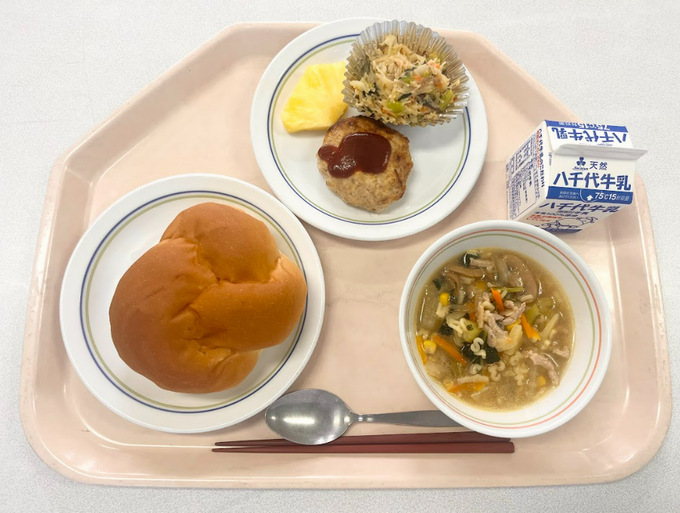 【B献立】ハチミツパン 豆腐ハンバーグ ビーフンソテー ABCスープ パインアップル