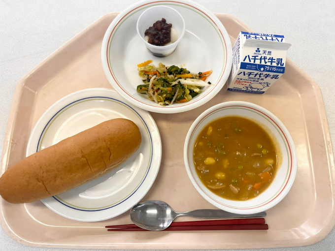 【B献立】黒糖コッペパン 豚肉と大豆のカレーシチュー ごまドレッシングサラダ あずき白玉