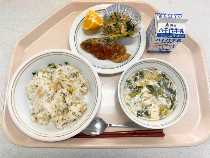 【A献立】小松菜としらすの炒飯 ボラの甘酢あんかけ くらげ入り中華和え チンゲンサイと卵のスープ みかん