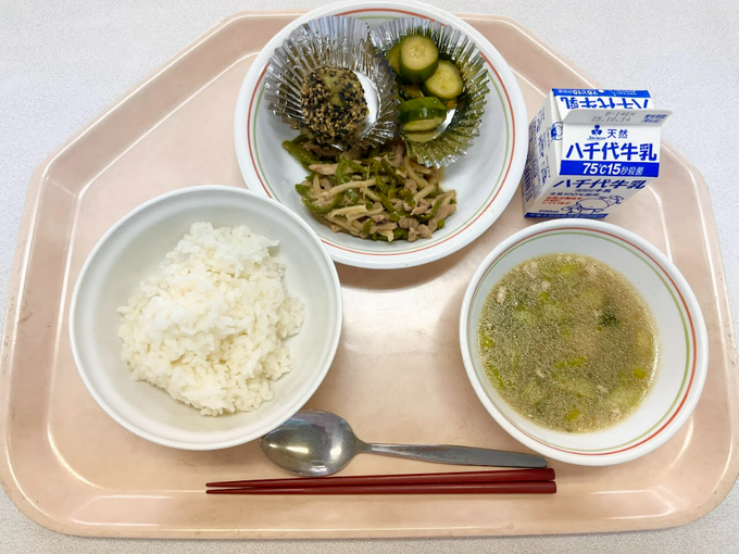 【A献立】ご飯 チンジャオロース ピリ辛きゅうり トック入りわかめのスープ さつまいものごまだんご