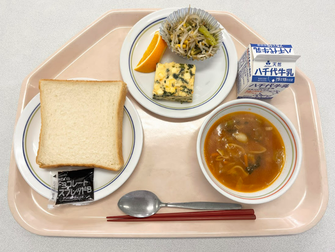 【B献立】食パン チョコクリーム ほうれん草とチーズのオムレツ 小松菜ともやしのソテー あさりといかのトマトスープ オレンジ