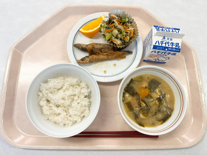 【A献立】麦ご飯 ししゃもの南蛮漬け 野菜とちくわのごま和え 打ち豆のみそ汁 オレンジ