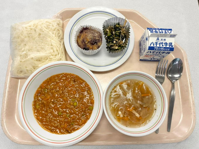 【B献立】ソフト麺ミートソース 小松菜とえのきの海苔サラダ オニオンスープ ブルーベリーマフィン